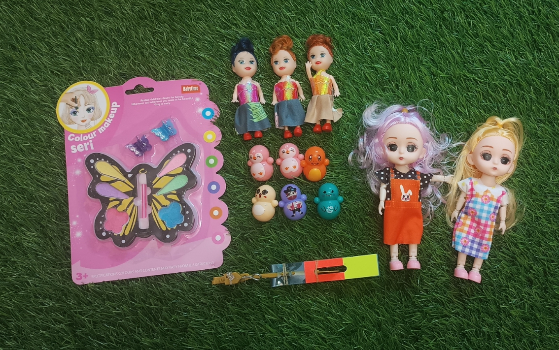 A fun and colorful toy set for young girls, featuring a mix of dolls, mini figurines, and a pretend makeup kit. This playful collection encourages creativity, role play, and imaginative fun. Perfect for gifting or everyday playtime.
